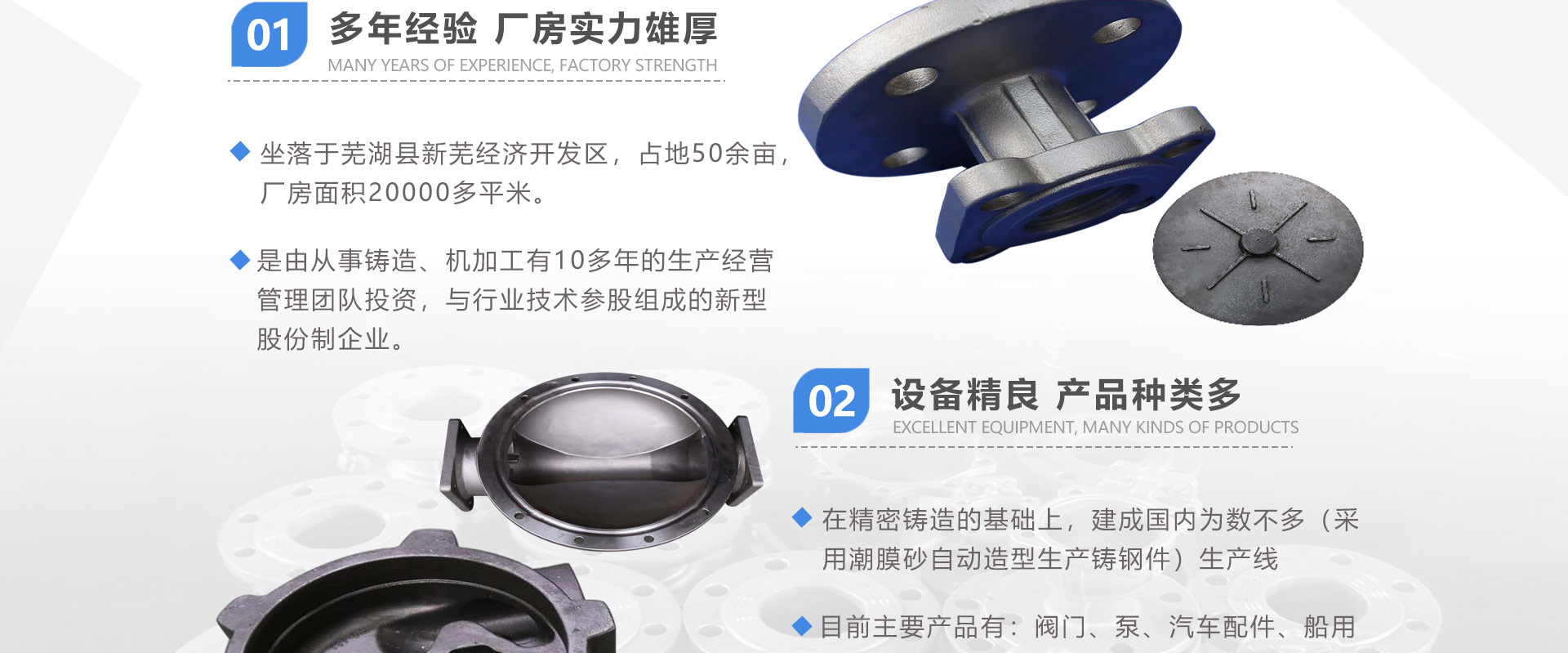 安徽偉工機械科技有限公司,坐落于安徽蕪湖新蕪經(jīng)濟開發(fā)區(qū),是一家専業(yè)從事鑄造產(chǎn)品設(shè)計、研發(fā)、生產(chǎn)、銷售于一體的企業(yè),公司為客戶的產(chǎn)品提供多樣的技術(shù)支持與設(shè)計,公司主要鑄造技術(shù)有潮模砂鑄造、硅溶膠精鑄工藝。主要產(chǎn)品有:不銹鋼閥門配件、泵閥配件、汽車配件、工業(yè)管道配件、工程機械配件、汽車配件等。材質(zhì)為:低合金鋼、304、316、316L、鉻鉬鋼、哈氏合金、碳鋼、雙相鋼等。公司已先后通過ISO9001和TS16949等多種體系審核,以完備的管理手段和齊全的檢測設(shè)備滿足客戶需求,進的設(shè)備,専業(yè)的技術(shù),嚴謹?shù)墓芾?,穩(wěn)定的質(zhì)量。服務(wù)客戶,鑄造未來,偉工誠摯的歡迎新老客戶共同商洽合作